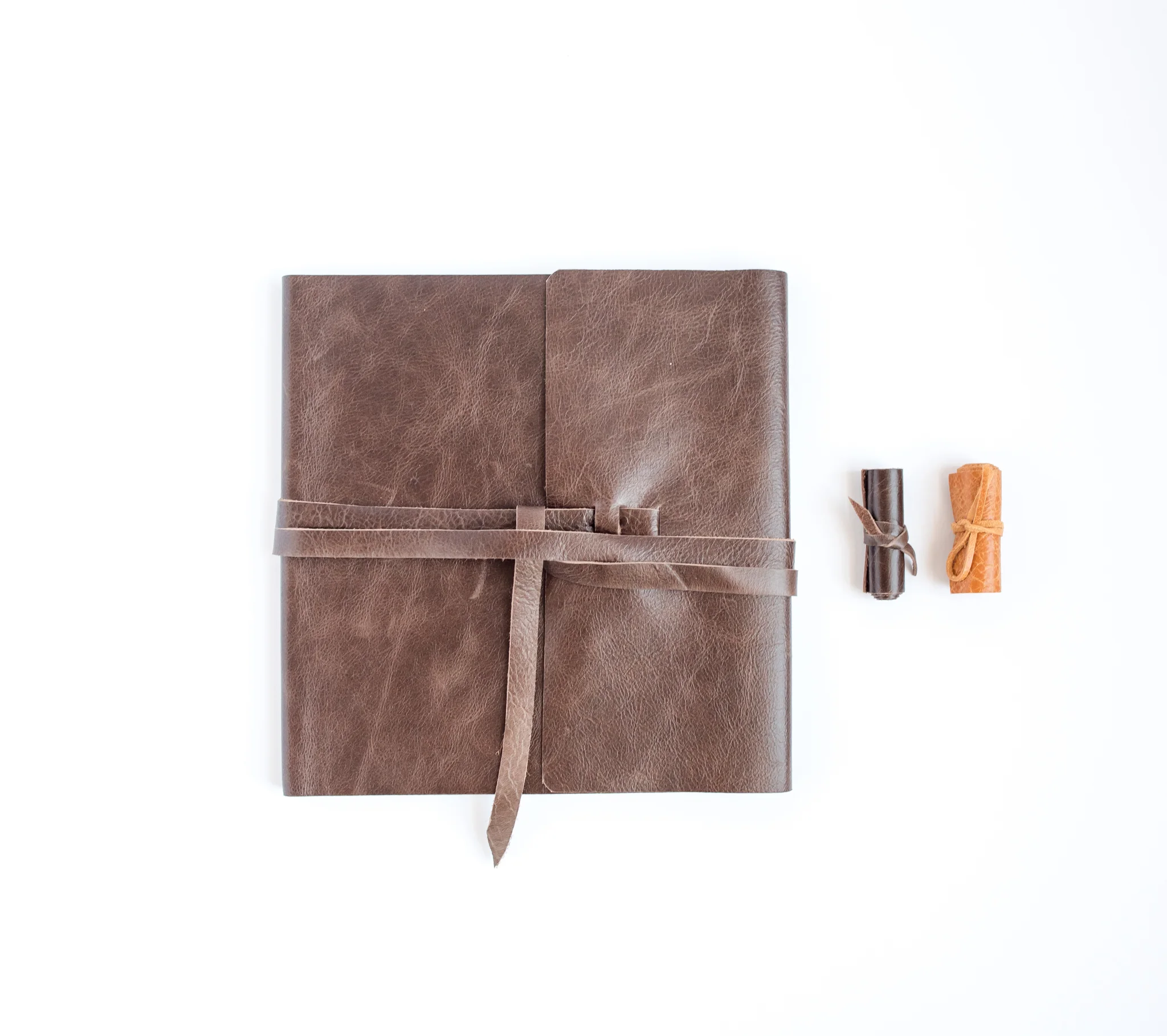Description: The Leather Engagement or Bridal Album comes in two different colors of leather. It has a beautiful leather strap that wraps around the book twice then you can tighten it shut. The leather is very soft. The photos are printed on thick fine art paper.